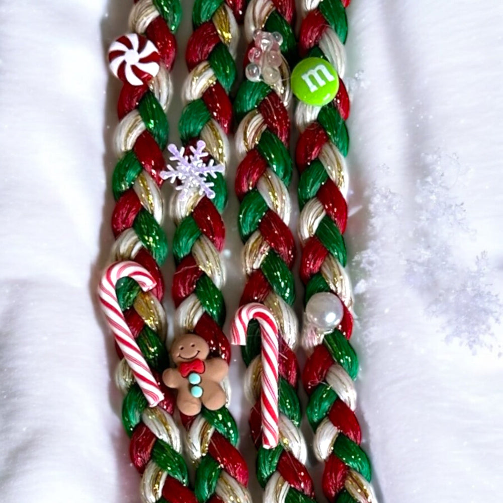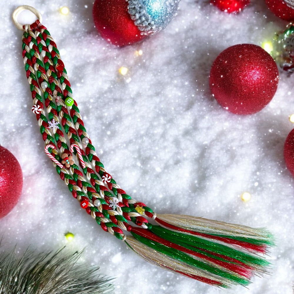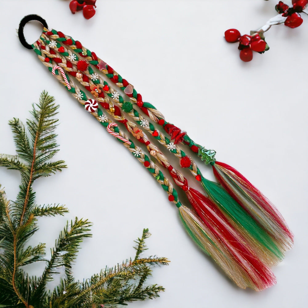 We start with a combination of shimmery hair in Golden Girl (blonde with gold tinsel), red and green and create 4 braids. To those, we embellish each with all sorts of fun Holiday themed gems and charms. Each ponytail is completely unique, just like the lucky kid who gets to wear it! Each ponytail is 24” long and comes on a sturdy hair elastic. Add it right over her natural ponytail or bun for instant festive fun and COLOR!