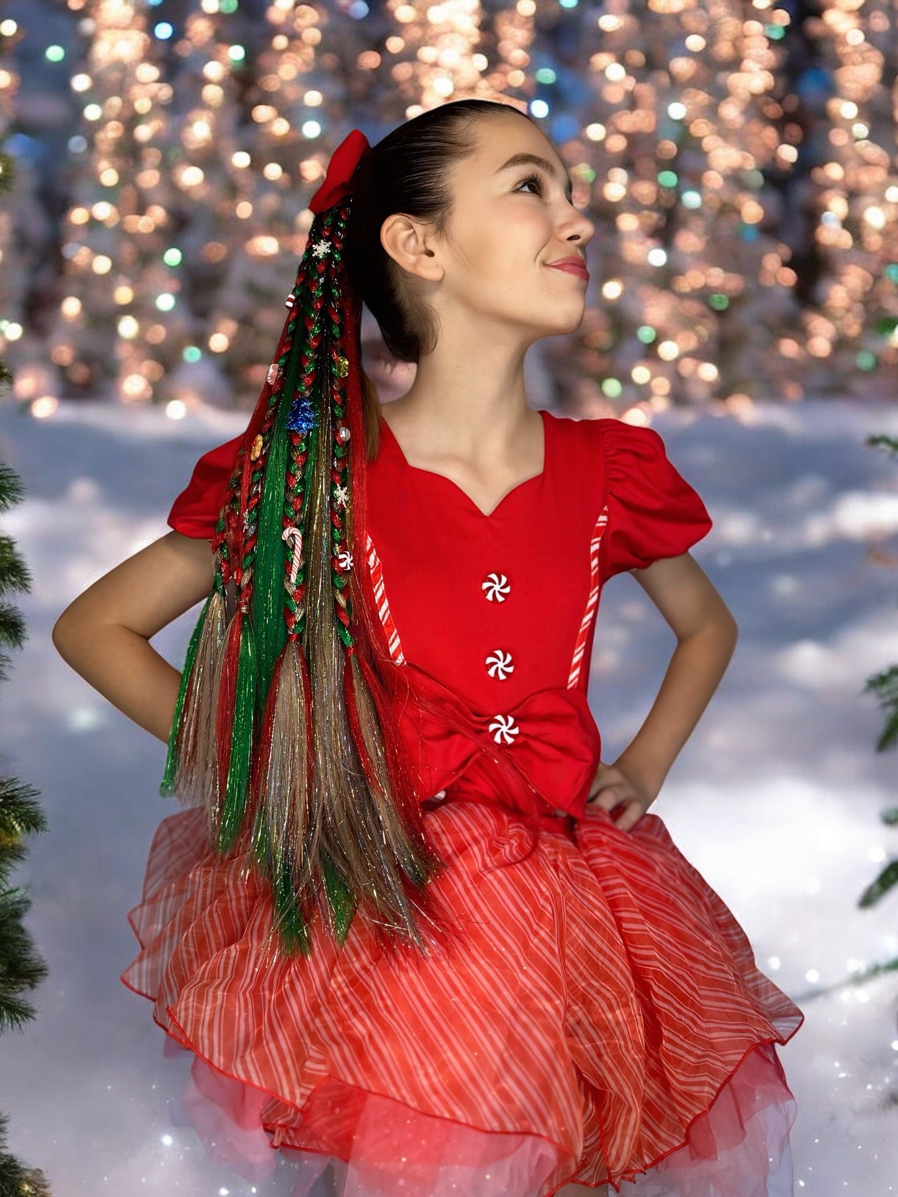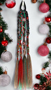 We start with a combination of shimmery hair in Cocoa Puffs (ombre brunette), red and green and create 4 braids. To those, we embellish each with all sorts of fun Holiday themed gems and charms. Each ponytail is completely unique, just like the lucky kid who gets to wear it! Each ponytail is 24” long and comes on a sturdy hair elastic. Add it right over her natural ponytail or bun for instant festive fun and COLOR!