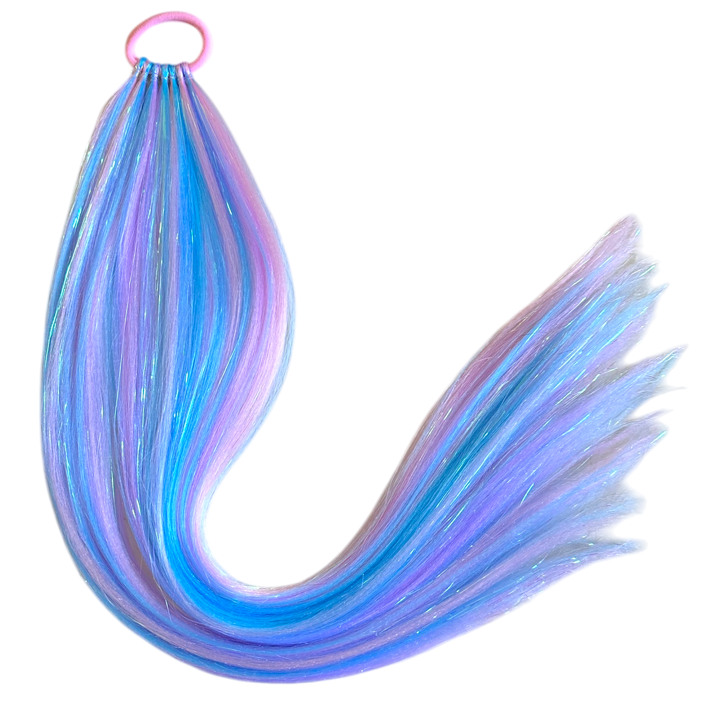 HO HO HO! Let’s get festive with this beautiful holiday ponytail. We use a combo of soft pink, aqua and lilac with a ton of iridescent tinsel to create this 50 gram beauty.
