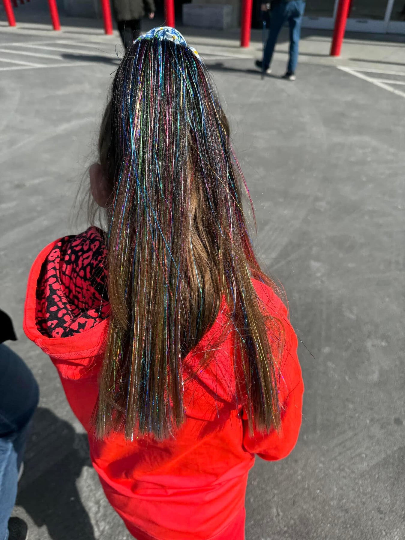 A warm ombré brunette ponytail with multi-colored sparkles.