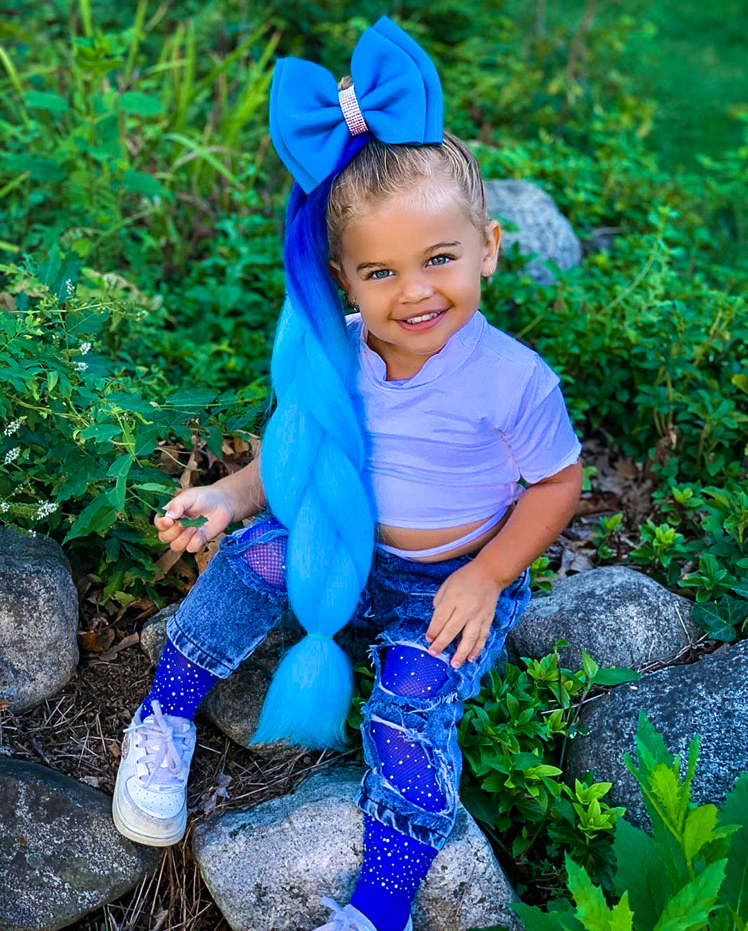 Hair is ombre dyed in bright, royal blue to light blue.