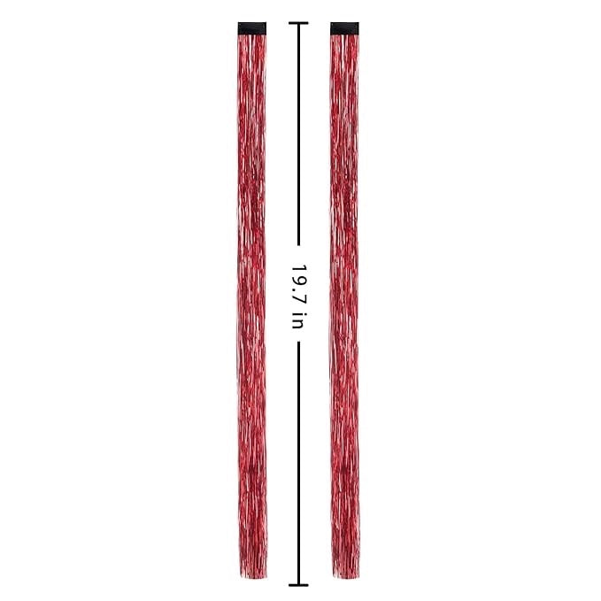 Add some sparkle to your style! Our clip-in tinsel hair extensions are made of holographic polyester fiber that is heat safe up to 275 degrees. Clips are sewn onto reinforced steel clips. Super long strips are 19" long and can be easily trimmed to any length. Each pack contains two (2) clip-in tinsel hair extensions.