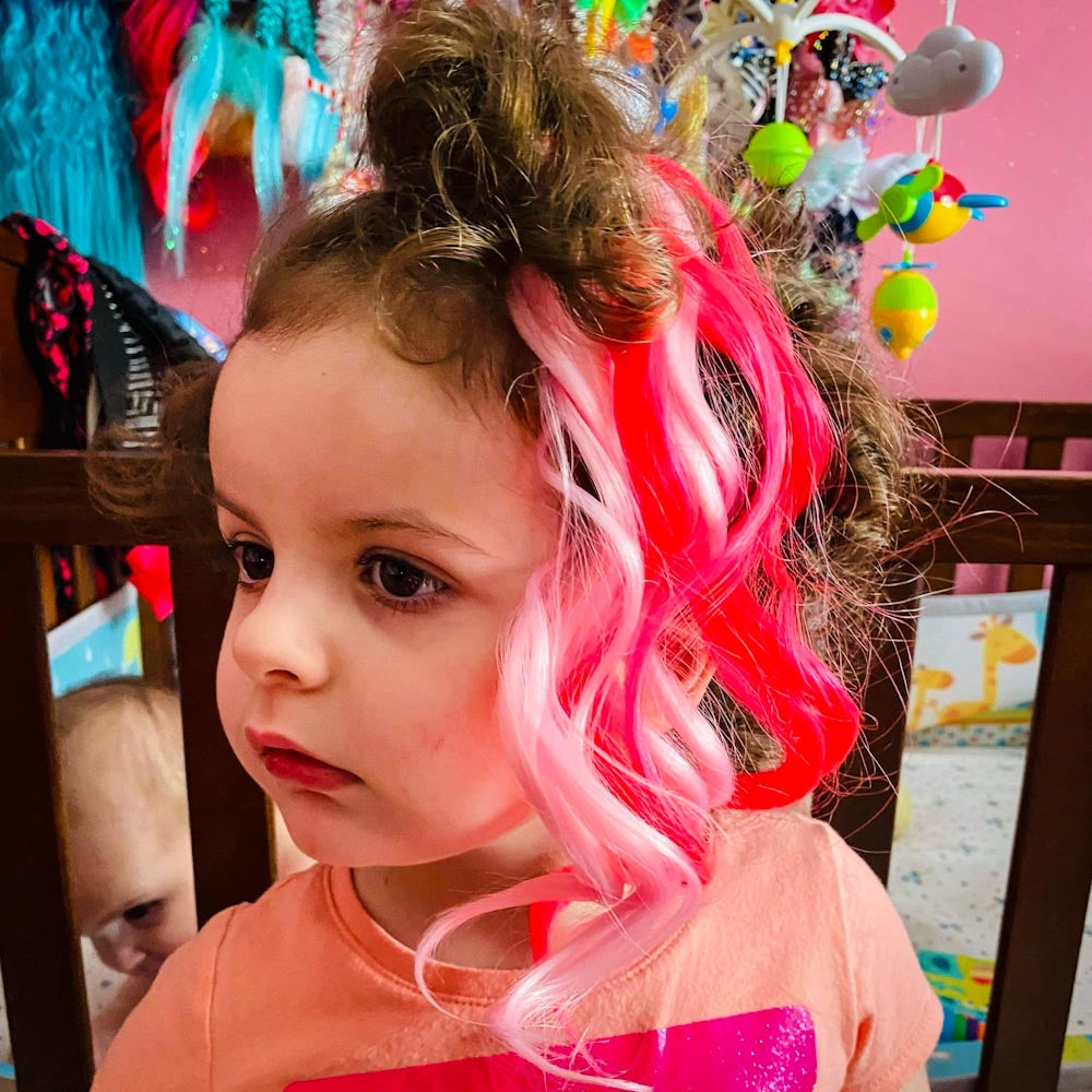 Our Mini Piggies are 12” long and come in a set of two. 4 colorful, silky wefts of synthetic hair comes on a sturdy ponytail elastic. Easily add to any length or hair texture in seconds. These lightweight extensions are comfy to wear all day - even for the smallest unicorns!