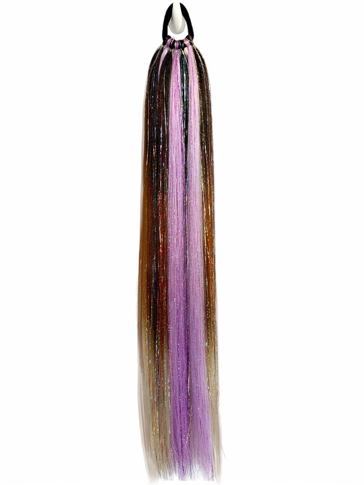 A warm ombré brunette ponytail with multi-colored sparkles. We’ve mixed in a nice blend of sugarplum hair with bright purple tinsel .