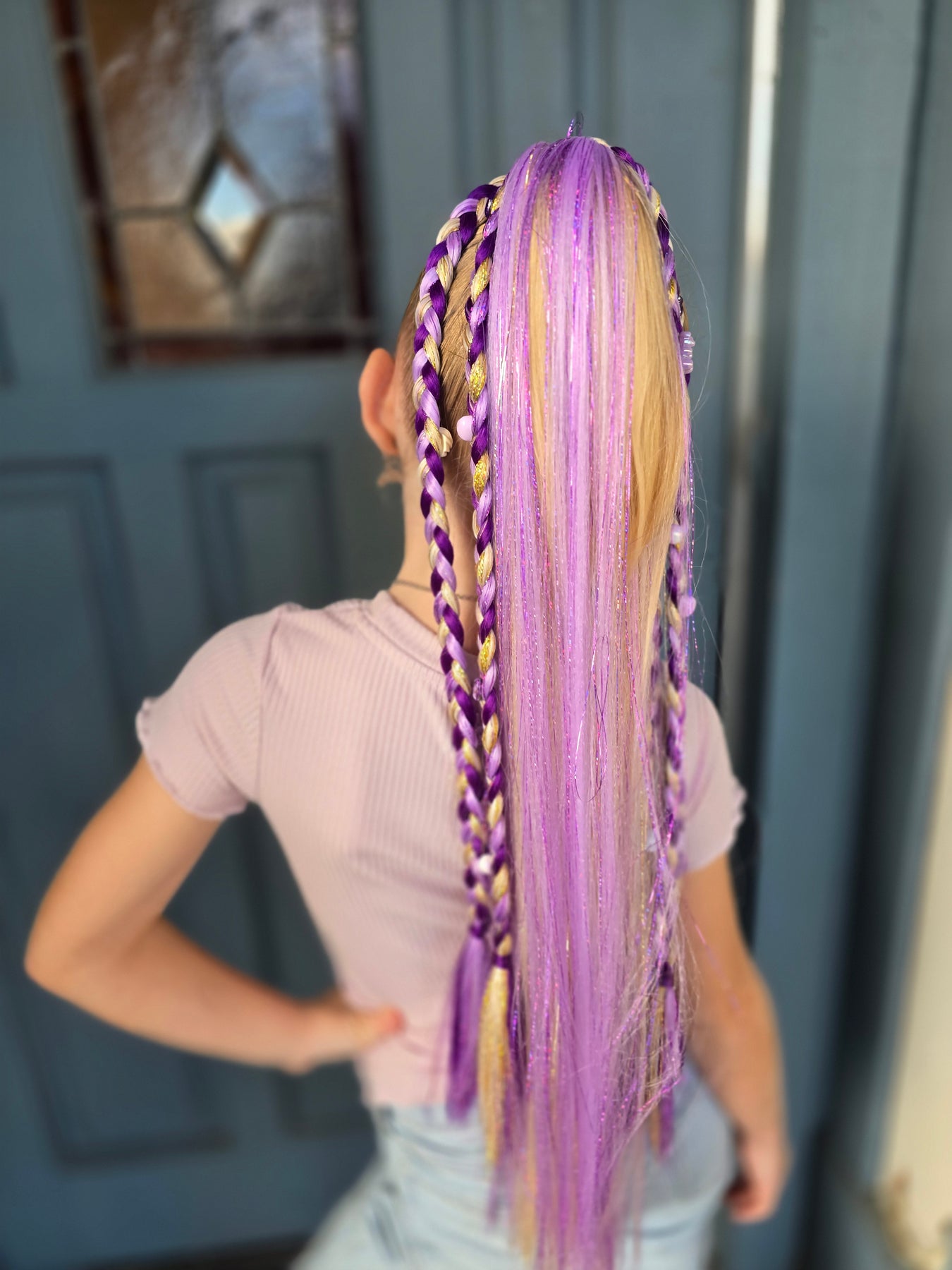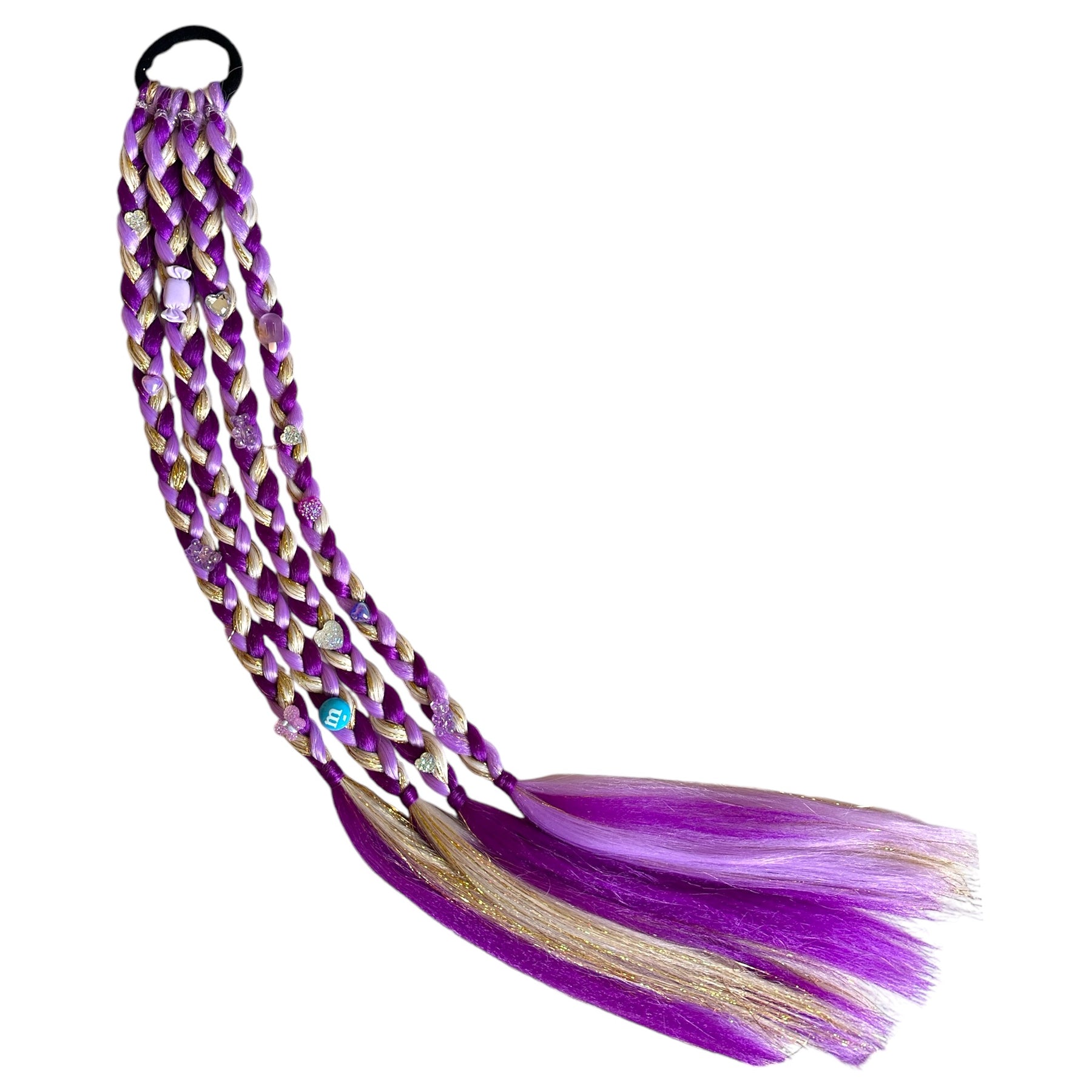 We start with one of our lovely Golden Girl Shimmer Tails. We add bright purple and lavender hair and braid 4 braids. Next, we use a selection of gems, pearls and charms and embellish each braid. Easily add it to any hairstyle with its included sturdy hair elastic.